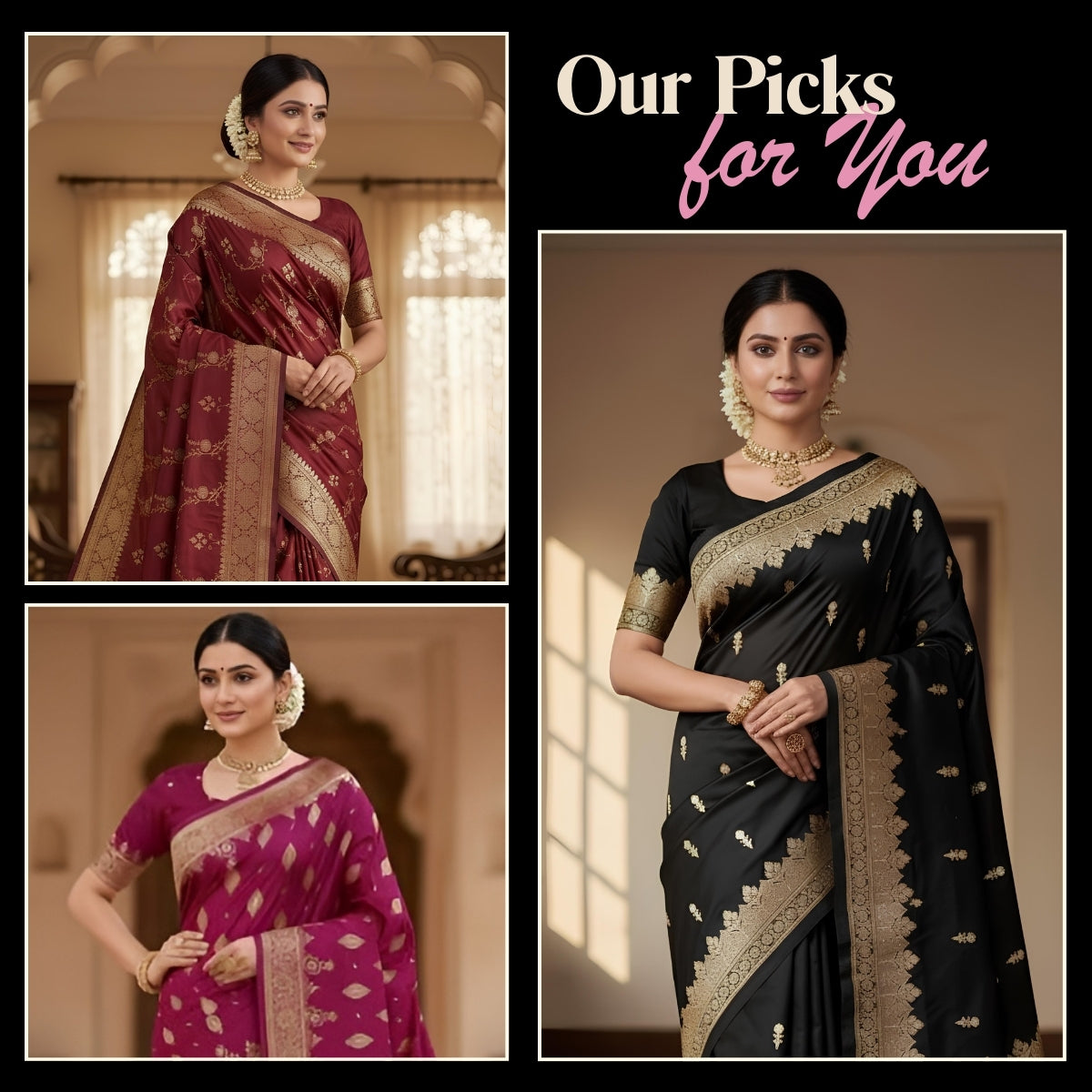 Smooth, lustrous, and radiant—our Satin Silk sarees bring a modern glow to traditional Banarasi craftsmanship.
